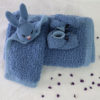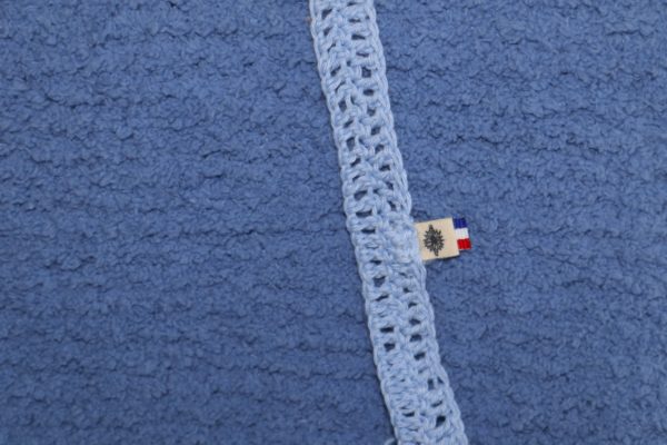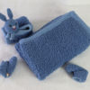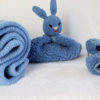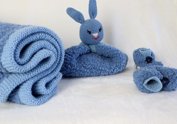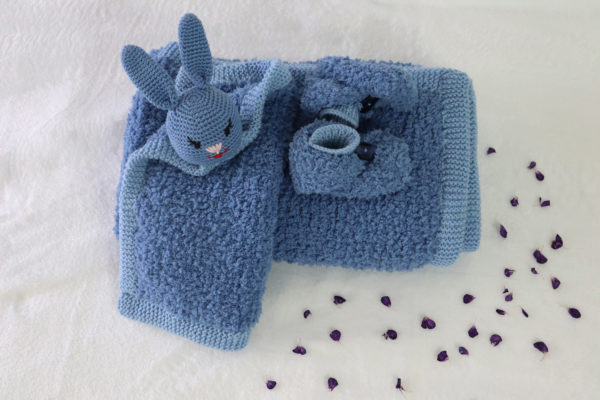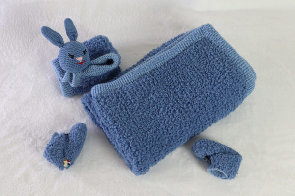 L’ ensemble bleu est composé d’une couverture douceur carré et d’un lapin doudou ainsi qu’ une paire de chaussons de 3/9 mois le plus un attache tétine en coton biologique.