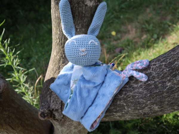 Un doudou lapin en tissus et en laine de coton biologique ! L’objet transitionnel incontournable qui aidera bébé pendant votre présence ou votre absence.
