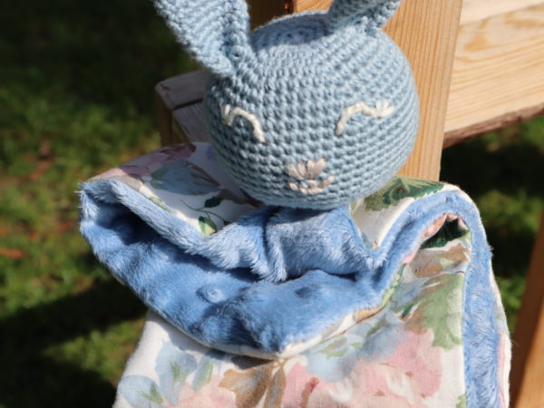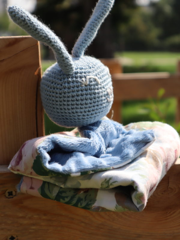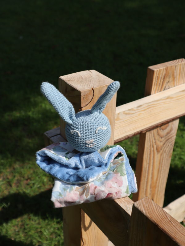 Un doudou lapin en tissus et laine biologique. L’objet transitionnel incontournable qui aidera bébé pendant votre présence ou votre absence.