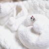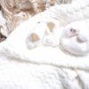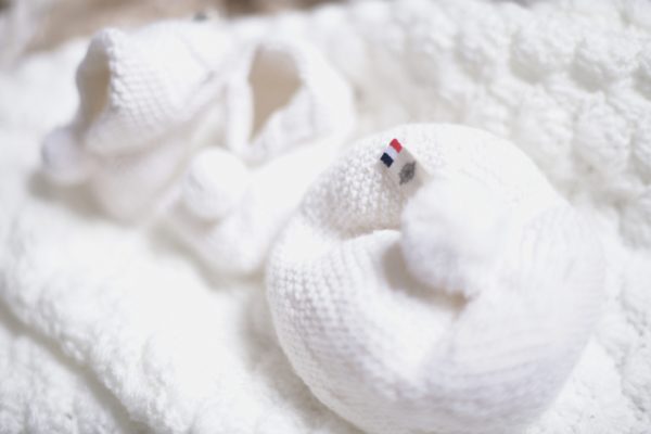 la petite paire de chausson et son bonnet tout blanc de Corine T design.