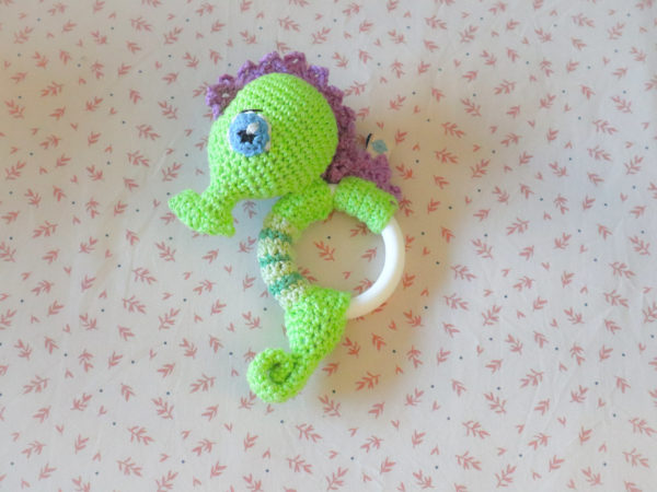 Un petit jouet d’éveil des plus originaux signée CorineTdesign pour stimuler votre enfant et satisfaire sa soif de découvertes. Ce joli hochet en forme d’hippocampe ne manquera pas d’attire la curiosité de bébé grâce à sa petite clochette qui s’anime quand on le secoue .Le hochet peut également être utilisé comme jouet d’éveil à suspendre à l’arche d’éveil ou à la poussette.